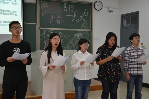 图为团日活动现场。记者 张婷婷 摄 整场活动主要围绕“一步一行遍神州,一逗一趣相宜彰和一言一行表忠心”三个环节内容进行。在一步一行遍神州环节集体观看纪录片《辉煌中国》部分片段,同学们看到了党的十八大以来,国家根据自身的现实状况,长其所长,化短为长,凭借人才优势和创新发展开辟了一系列新兴工业。看到中国五年来所取得的举世瞩目的伟大成就,同学们无不热血沸腾,纷纷表达了对党一路以来发展不易的喟叹,也为五年来国家所取得的成果感到骄傲,纷纷感叹:真是厉害了我的国! 一逗一趣相宜彰环节,团支部内来自祖国7个不同省份的同学用方言诵读《献礼十九大》,浓烈的家乡话虽然难以听懂,但无不热切的表达出青年同学对家国的挚爱情怀。来自院内17级的“小萌新”,借反映“医患关系”的小品《365个祝福》,用诙谐幽默的语句聚焦民众热议话题,也表达出对生活越来越好、祖国越来越强的期盼与信心。