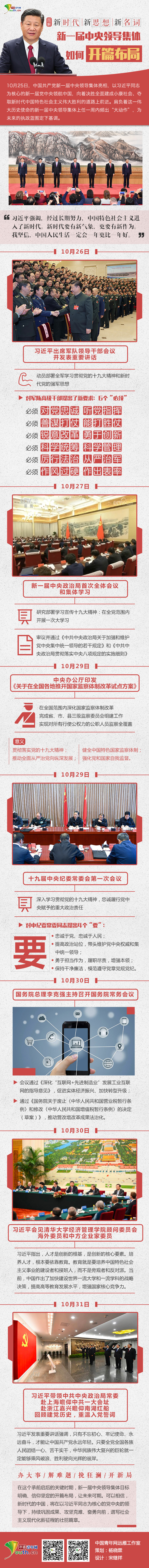 中国青年网北京11月1日电(记者 杨晓霖 宋继祥)10月25日,中国共产党新一届中央领导集体亮相,以习近平同志为核心的新一届党中央领航中国,向着决胜全面建成小康社会、夺取新时代中国特色社会主义伟大胜利的道路上前进。肩负着这一伟大历史使命的新一届中央领导集体上任一周内频出“大动作”,为未来的执政蓝图定下基调。